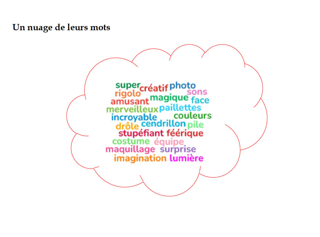 J’ai beaucoup aimé les ateliers parce que c’était agréable à faire. J’ai particulièrement aimé le fait qu’on puisse participer à tout et voir le résultat après. Lerésultat, je ne m’attendais pas à ça ! C’était incroyable et merveilleux. Zelda